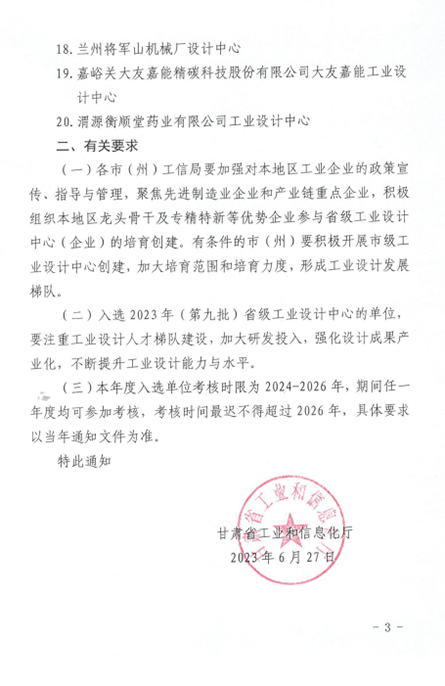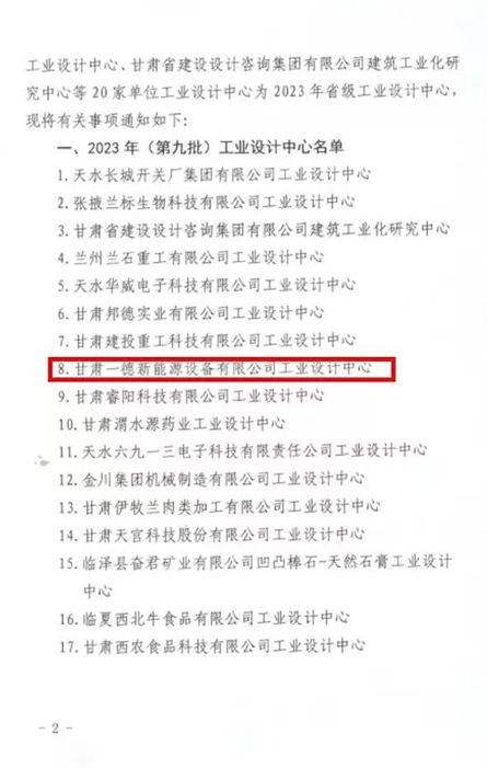 6月27日,甘肅省工信廳公布了2023年(第九批)省級工業(yè)設(shè)計中心名單,白銀高新區(qū)企業(yè)甘肅一德新能源設(shè)備有限公司成功獲批省級工業(yè)設(shè)計中心。截止目前,白銀高新區(qū)已累計認(rèn)定省級工業(yè)設(shè)計中心5家。